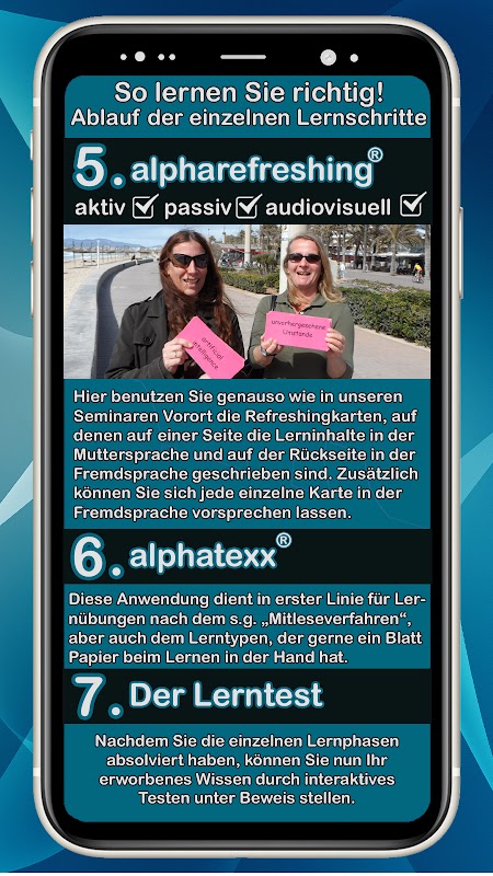 Bu mobil öğrenme varyantı aynı zamanda başarılı ve ödüllü Alpha Institute yönteminin öğrenme aşamalarına dayanır ve size maksimum öğrenme başarısını garanti eder.