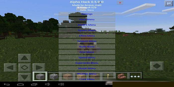 Cheat mod AlphaHack you can play with it as in single player and on servers MCPE. There is a lot of functions in ModPE. Alpha hack will be helpful even for those players who do not particularly like the cheat function. You will be able to change the background color and take advantage of other entertainment features.