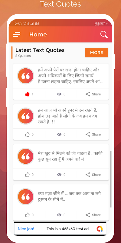 Like, View, Share, Save Wallpaper option for image and Like, View, Share, Copy options for text quotes.