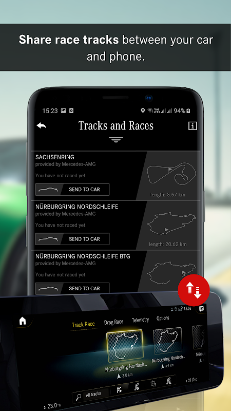 Mercedes-AMG GT, GT S, GT C ve GT R için, tüm Mercedes-AMG C 43, C 63 ve C 63 S ve AMG TRACK PACE'in olmadığı tüm AMG-Mercedes GLC 43, GLC 63 ve GLC 63 S Araç bilgi-eğlence sistemi içinde görüntülenen yarış sırasında belirtilen özelliklerin çoğu akıllı telefon ekranının kendisi kullanılarak destekleniyor.
