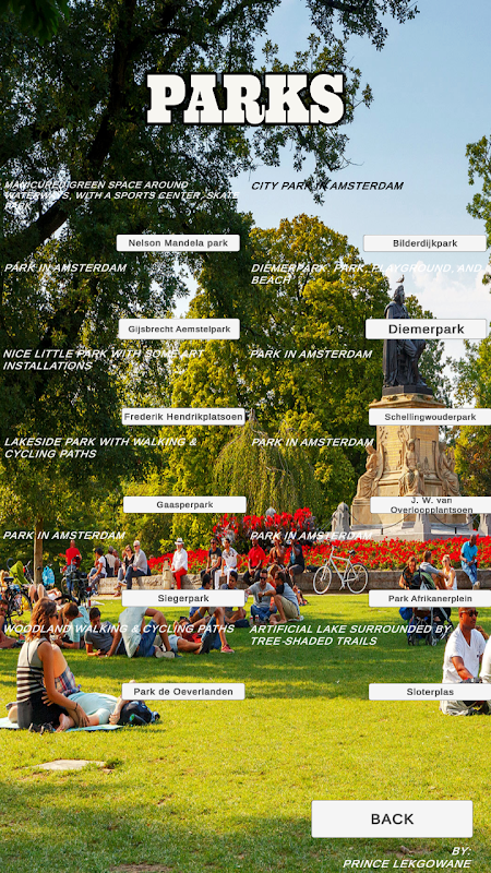 Uygulama listesi ve kullanıcıları en iyi İyi Yemek, Gece Kulüpleri, İç Mekan Eğlencesi, Dış Mekan Eğlencesi, Manzaralı Parklara bağlar ve ayrıca Amsterdam'daki indirimler, tema parkı eğlencesi ve harika yemekler ve çok daha fazlası hakkında sizi anında bilgilendirmek için bir bildirim özelliğine sahiptir.