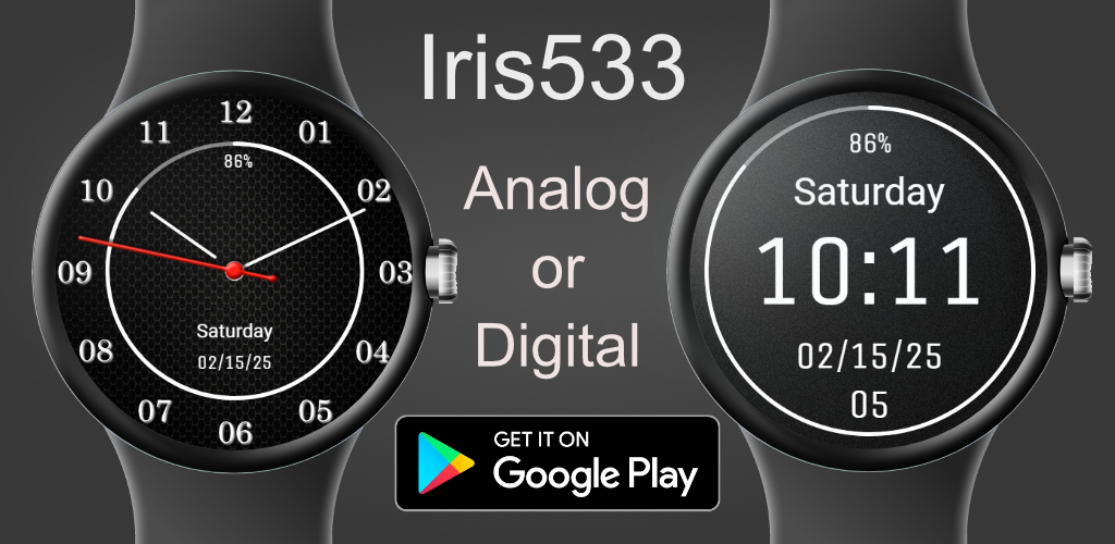 Iris533, hem analog hem de dijital olan basit, benzersiz bir saat yüzüdür. Her iki formatta da saati söylemenin temel işlevini sağlar ve arka plan seçimlerinin yanı sıra renk seçenekleriyle de yüksek görünürlük sağlar. API düzeyi 30 ve üzerini kullanan Android saatler için tasarlanmıştır.