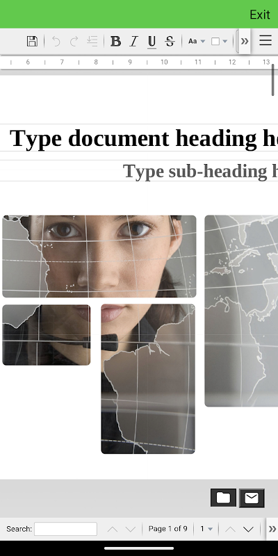 - DOC, DOCX ve ODT belgeleri için düzenleyici. Microsoft Word, OpenOffice Writer ve LibreOffice Writer kullanılarak yazılmışlarsa bunları oluşturabilir, düzenleyebilir ve görüntüleyebilirsiniz.