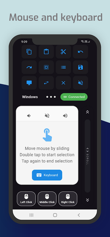 ✔ Sorunsuz imleç hareketi ve kaydırma için telefonunuzu kablosuz dokunmatik yüzey olarak kullanma.