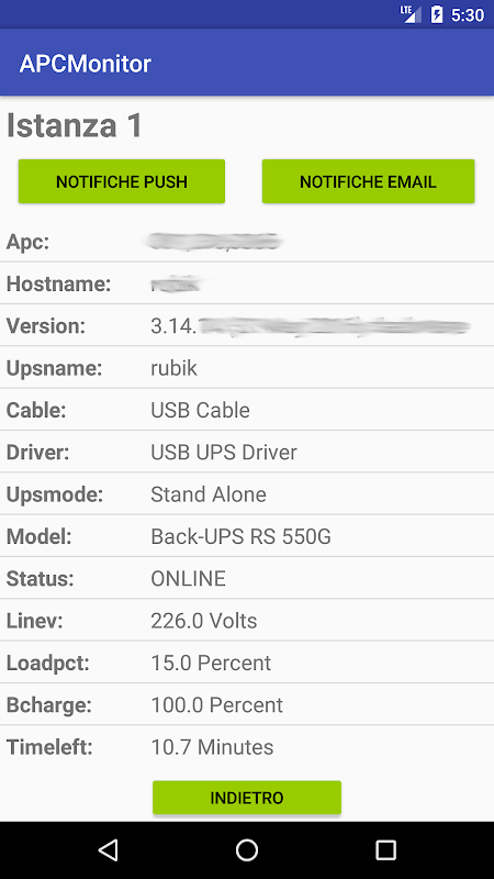 ATTENZIONE: l'applicazione necessita di comunicare con un'applicazione web da installare su un dispositivo connesso fisicamente al gruppo di continuità. Le autorizzazioni per IMEI e Phone ID vengono usate per associare i dati per l'invio delle notifiche push sui dispositivi. Tali dati vengono salvati nell'applicazione web che dovrà essere gestita da sistemi esterni di vostra proprietà.