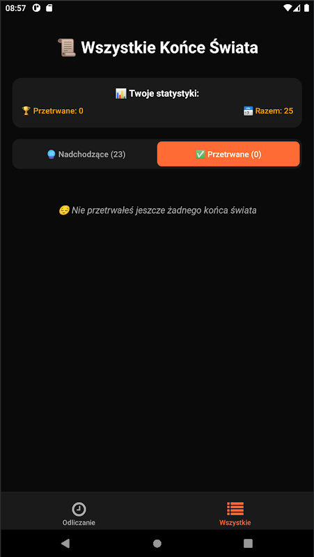 Ertelemek yerine, "zaman baskısını" eğlenceli bir şekilde kullanın! Uygulama, dünyanın sonu tahminlerini (Maya takviminden YouTube ve Facebook'tan modern teorilere) gerçekten işe yarayan bir görev sistemiyle birleştiriyor. ⚡ Temel Özellikler: