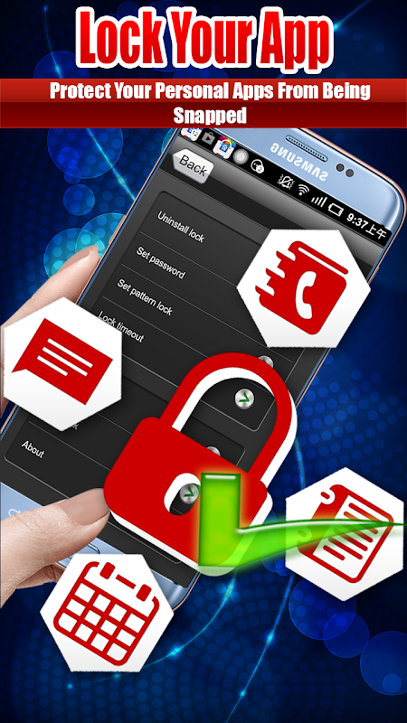Artık bu şaşırtıcı özellikli uygulama ile özel uygulamalarınızı ve videolar ve resimler gibi özel eşyaları kolayca kilitleyebilirsiniz. Bu parmak izi uygulaması soyunma, pin uygulaması soyunma ve desen uygulama soyunma gibi üç farklı kilitler üzerinde çalışan bir uygulama özelleştiricisidir. Cep telefonunuzdaki uygulamaları kilitlemenizi kolaylaştıran en iyi özel uygulama dolabı. Artık eşyalarınızı saniyelerle özelleştirebileceğiniz şekilde telefonunuzu daha güvenli hale getirin. Bu uygulama kilidi 2019, uygulamalarınızı kilitlemek için kullanımı kolay bir kullanıcı dostu ve kullanımı kolaydır. Bu uygulama App Locker - Ücretsiz App Locker Master, telefonunuz için bir kilit ustası gibidir. Parmak izi ve pin ve desen kilidi ile telefon uygulamalarınızı kolayca kilitleyebilirsiniz. Bu uygulama, telefonunuzu olağan dışı etkinliklerden korur ve her zaman telefonunuzu güvende tutar. Telefonunuz için en iyi uygulama dolabının hangisi olduğunu sorabilirsiniz. uygulama App Locker - Ücretsiz App Locker Master benim uygulamaları kilitlemek için. Bu sizin için yeni bir uygulama soyunma ana 2019. Cep telefonunuzdaki uygulamaları kilitlemenizi kolaylaştıran en iyi özel uygulama dolabı. Artık eşyalarınızı saniyelerle kişiselleştirebileceğiniz daha güvenli hale getirin. Telefonunuzu daha güvenli hale getirin. Sonra sizin için bu Uygulama Locker'ı - Ücretsiz Uygulama Locker Master'ı, uygulamaları soyunma ustası ile korumak için en iyisidir. aktivite. Maksimum uygulama soyunma güvenliği, uygulamanızı kilitler.