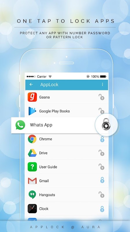 uygulama, fotoğraf, dosya, videoyu kilitlemek için Aura App Lock kullanılır.