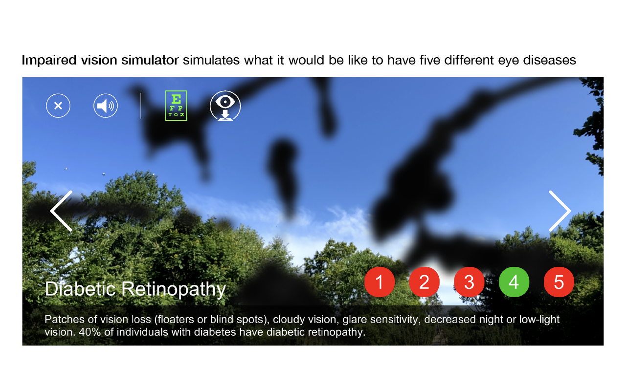 Download and launch the app, and aim the vision simulator at the image you want to see through the eyes of someone with vision challenges. Or, aim your device’s camera at any flat surface such as the floor or a table, and experience a virtual walk-through of a human eye.