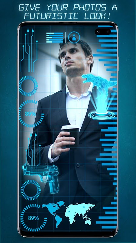Edit photos like a pro with our new Ar Photo Editor App - Hologram Camera App. This ar camera virtual hologram photo editor with ar face filters is very easy to use. Open our ar reality camera to take a photo or upload pic from your device. Than add ar stickers and make sci fi photos with holographic themes in just a few seconds. Give your photos a futuristic look with one of the best photo editing apps in the world. Editing pics with this augmented reality camera app will help you to make interesting ar pictures and publish them on social networks to get more likes. You can use our augmented reality creator and ar camera superhero to look like jarvi hacker. Try out hologram photo editor app and perfect ar camera and you will be impressed with all its photo editing features.