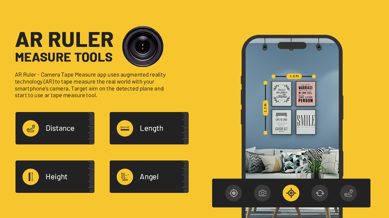 AR Ruler - Mezura Kamera uygulaması, akıllı telefonunuzun kamerasıyla gerçek dünyayı ölçmek için artırılmış gerçeklik teknolojisini (AR) kullanır. Tespit edilen düzlemde hedef nişan alın ve ar mezura aracını kullanmaya başlayın.