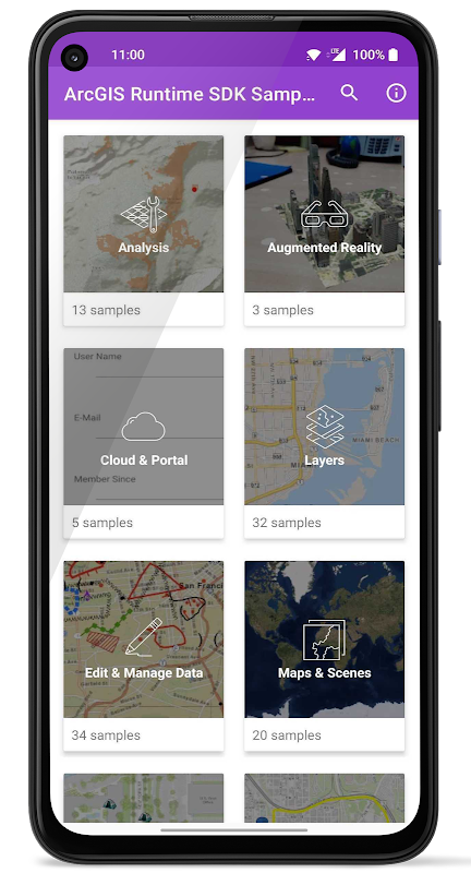 Kendi özel uygulamalarınıza dahil edebileceğiniz mevcut işlevselliği ilk elden deneyimlemek için örnekleri keşfedin. Uygulama içinden ve github sayfamızdan (https://github.com/Esri/arcgis-runtime-samples-android) her örneğin arkasındaki koda göz atın ve SDK'yı kullanmanın ne kadar kolay olduğunu görün.