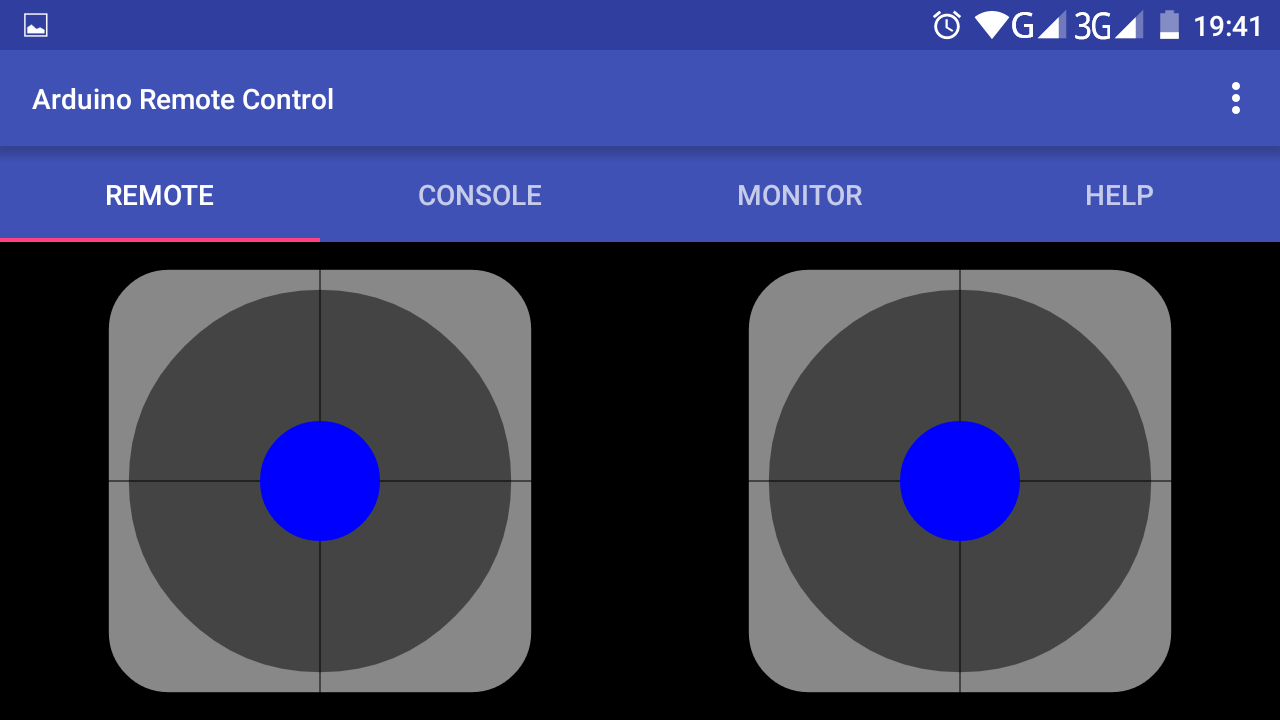The app includes a joy stick view to allow easy control of the remote device. In addition individual remote commands can be sent directly to the Arduino device for processing and control using a console.