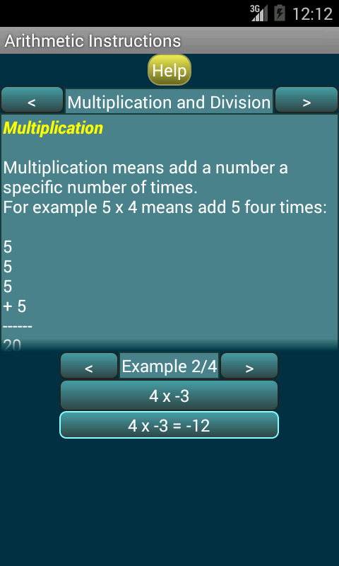 Arithmetic Teacher provides addition, subtraction, multiplication and division instructions and allows students to practice arithmetic. Tap the Instruction button to learn about arithmetic and see examples, then tap the Practice button to earn medals as you quiz yourself. Select an arithmetic operation from the spinner, then practice equations appear with 3 multiple choice answers. Tap the correct answer and the selection turns green, tap an incorrect answer and the selection turns red. Your total correct answers are displayed. Select as many pages as desired to practice. Clear your selections from the menu options. When you tap the correct answer 1 out of 3 times, you earn a Bronze medal, when you tap the correct answer 2 out of 3 times, you earn a Silver medal, when you tap the correct answer 3 out of 3 times, you mastered that equation and earn a Gold medal. Tap the 'Begin New Quiz' to test yourself again until you earn all gold medals.