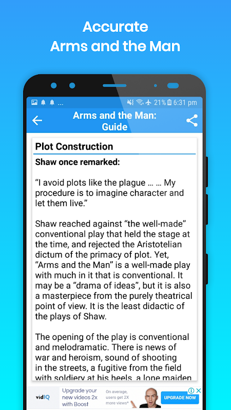 This Guide app works both online and offline, and contains 28 basic topics about one of the famous plays of George Bernard Shaw, Arms and the Man.