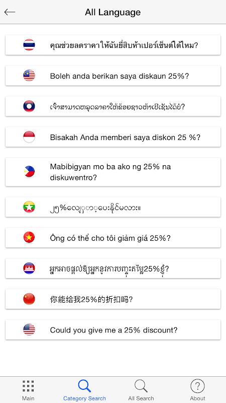 Bu uygulama bir turist seyahat ederken karşılaşılan bekleyebilirsiniz gerçek yaşam durumuna göre çeşitli senaryolara ilişkin neredeyse 22.000 cümleler sunmaktadır.