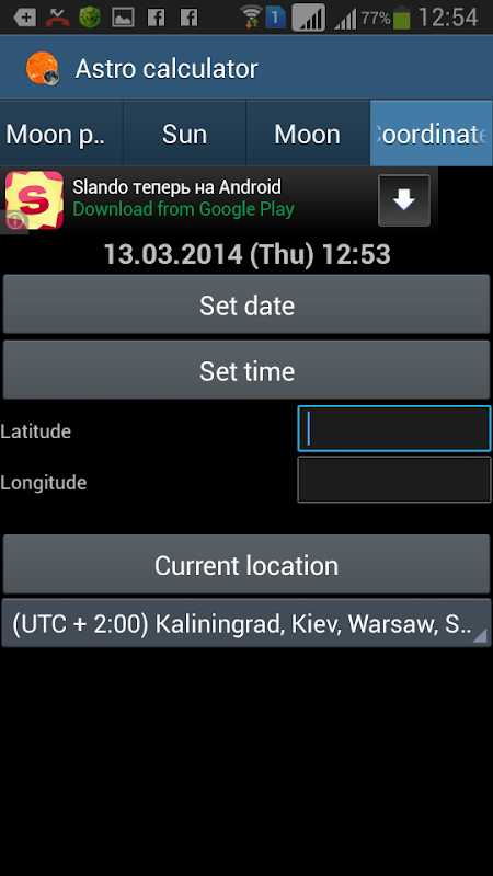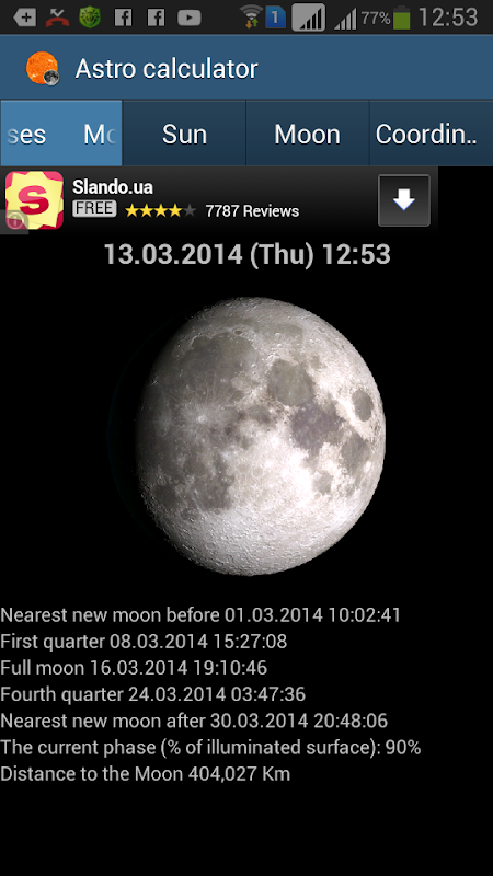 All data are calculated based on geographic coordinates of the user and the current date. But also you have the opportunity to set any position and time in order to determine the phase of the Moon for any date in the future or the past, as well as to determine the position of the Moon and the Sun.