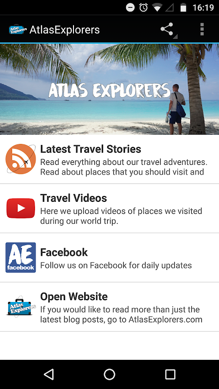 The AtlasExplorers app is part of AtlasExplorers.com and allows you to follow the adventures of Chris and Seulki, including their blog posts, YouTube videos and Facebook updates.