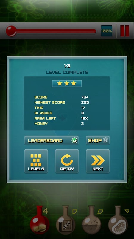 Atomic slash is an excellent addictive casual game. Cut the cool atomic board by passing your finger over it until the red pressure bar is full.