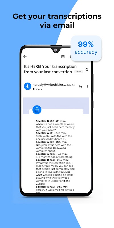 Ses dosyanızı uygulamaya yükleyin ve 3 dakika içinde röportajın bir dökümünü alacaksınız. Transkripsiyon, zaman damgasını içerecek ve ayrıca bir konuşmacı her konuştuğunda metni ayıracaktır.