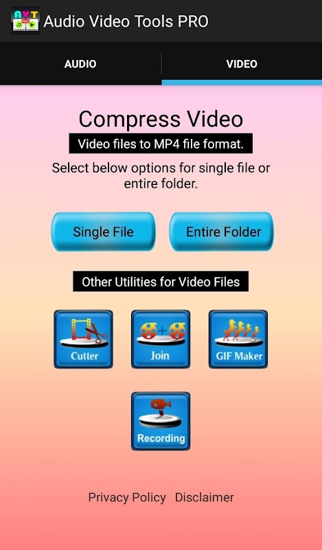 Audio Video Tools Pro Uygulaması olarak da bilinen AVT Pro, müzik ve video tutkunlarına özel olarak hazırlanmıştır. Bu araçla bir klasörde bulunan tüm ses/video dosyalarınızı sıkıştırmak gibi birçok işlemi yapabilirsiniz. Bu araç tüm dosyaları tek tek sıkıştıracak ve cihazınızdaki "AVT PRO" klasörüne kaydedecektir.