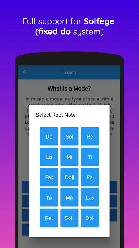 Öğrenme modunda, sesin nasıl olduğunu anlamak için herhangi bir aralık, ölçek, mod, akor veya kadans çalabilirsiniz. Aralıklar ve akorlar hem harmonik hem de melodik olarak çalınabilir.