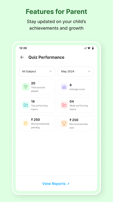 Öğrenciler Burs Kazanır: Öğrenciler sınava girerler ve hedef performansa ulaşırlarsa (%80) ayda 50 INR alırlar ve her öğrenci ücretsiz burs olarak ayda en fazla 1.000 INR alabilir. Tutar, ebeveynlerinin mobil cüzdanlarına aktarılır.