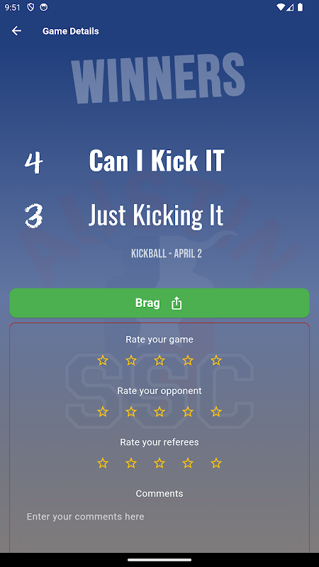 Austin Sports & Social Club Android uygulaması, oyuncuların mobil cihazlarında bildirimler (yağmur yağmurları, sonuçlar, lig haberleri ve daha fazlası) almasına, takım arkadaşlarıyla sohbet etmesine, şehir genelinde indirimler almasına ve takım programlarını ve sıralamalarını görüntülemesine olanak tanır.
