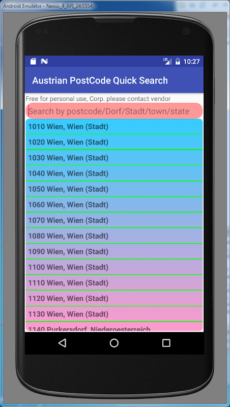 This app will allow you to find a postal code within Austria. It is quick and fast. You can search by post code or Dorf/Stadt/suburb/town or state. You can enter partial name or post code. Search results will be displayed as you type.