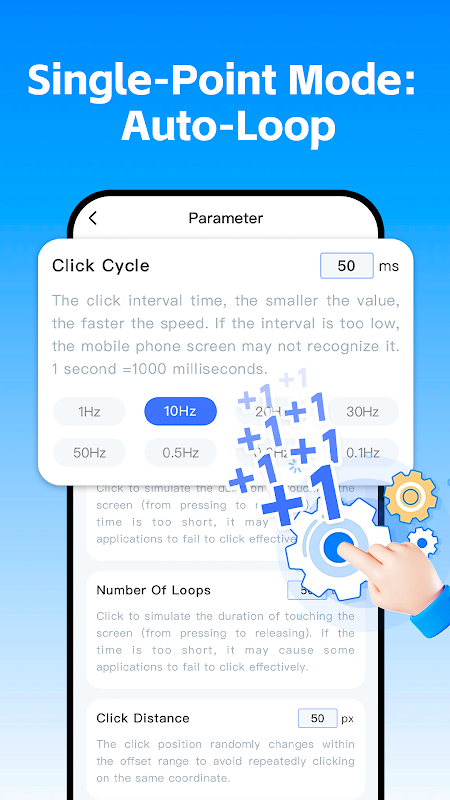 Temel Auto Clicker özelliğimiz, basit dokunuşların çok ötesine geçer. Tıklamalarınızın her yönü üzerinde tam kontrole sahipsiniz. Karmaşık eylemler gerçekleştirmek için tek tıklamaları, çift tıklamaları ve kaydırmaları zahmetsizce ayarlayın. Tıklama aralıkları, süre ve döngü sayıları gibi temel parametreleri tam ihtiyaçlarınıza uyacak şekilde özelleştirin. Daha doğal ve algılanamayan bir otomasyon için, rastgele tıklama konumu özelliğimiz insan davranışını taklit ederek dokunma konumlarını akıllıca değiştirir. Bu düzeyde özelleştirme, mobil oyunlardan üretkenlik araçlarına kadar her uygulama ile sorunsuz entegrasyon sağlar.
