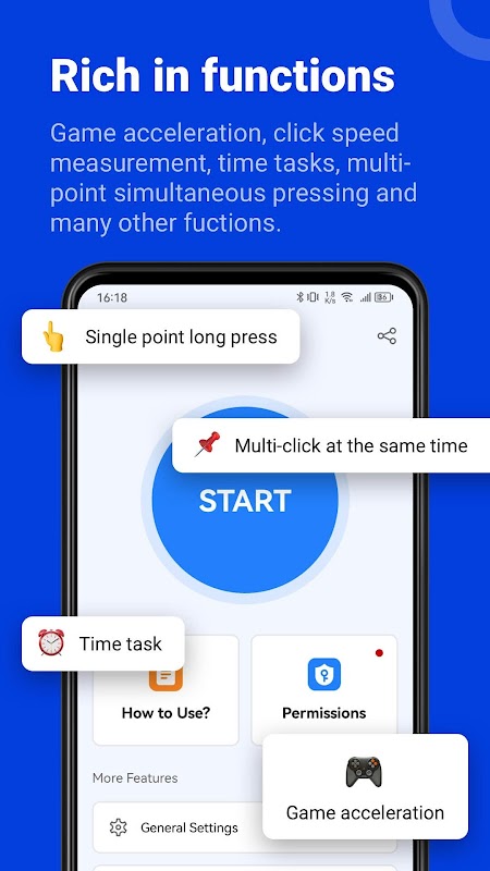 Auto Clicker, otomatik bir tıklama aracıdır ve ayrıca cep telefonu ekranında tıklamayı otomatik olarak simüle eden bir araçtır. Kullanıcının yalnızca zamanı ayarlaması gerekir ve ardından otomatik olarak herhangi bir konuma tıklar veya kaydırır.