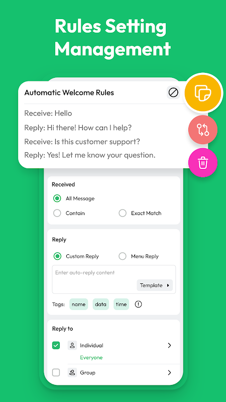 Otomatik Yanıt, çok sayıda mesajlaşma uygulamasında yanıtınızı otomatikleştirmeye adanmış bir otomasyon aracıdır ve 3 temel özellik ile sosyal iletişimi geliştirir: Kurallara dayalı anında yanıtlar için Yanıtlayıcı, planlanmış veya yinelenen mesajlar için Tekrarlayıcı ve tutarlı, özel olarak tasarlanmış yanıtlar için Replicator.