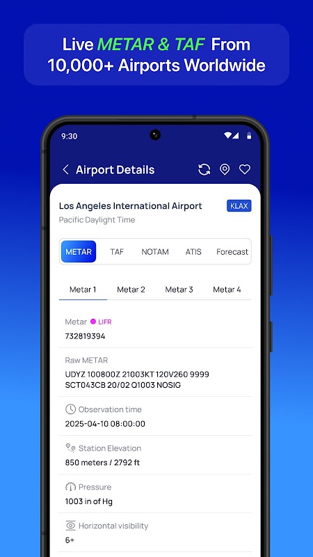 Aviation Weather, pilotlara dünya genelinde 10.000'den fazla havaalanından METAR ve TAF raporlarına erişim imkanı sunar. Hızlı ve güvenilir uçuş planlaması için tasarlanan uygulama, havaalanı hava durumu verilerini temiz, pilot odaklı bir arayüzde sunar.