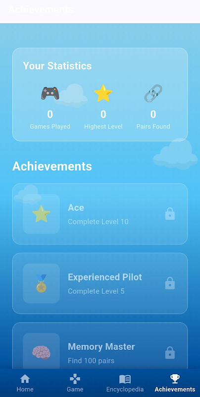 Başarılar sistemi, oyuncunun ilerlemesini izler ve yolculuk boyunca kilometre taşlarını ödüllendirir. Kullanıcılar oynanan toplam oyunları, ulaşılan en yüksek seviyeleri ve toplam eşleşen çiftleri görüntüleyebilir. Çaylak Pilot, Deneyimli Pilot, As, Hafıza Ustası ve Hız Şeytanı gibi başarılar, oyunculara görsel olarak belirgin simgeler ve kilidi açılan başarılar için altın vurgularla net hedefler sunar. Bu sistem, kullanıcıları hafızalarını geliştirmeye, tüm seviyeleri tamamlamaya ve uygulamanın tüm özelliklerini keşfetmeye motive eder.