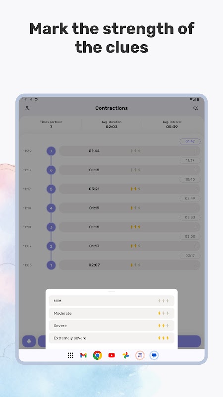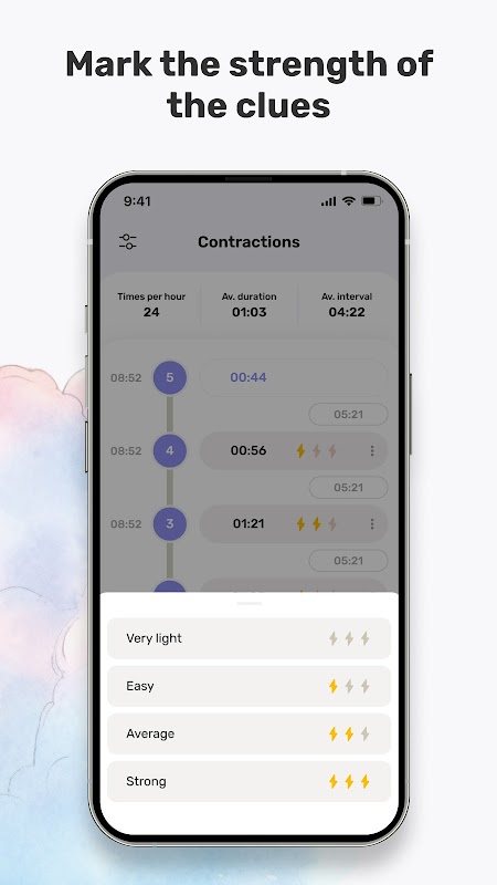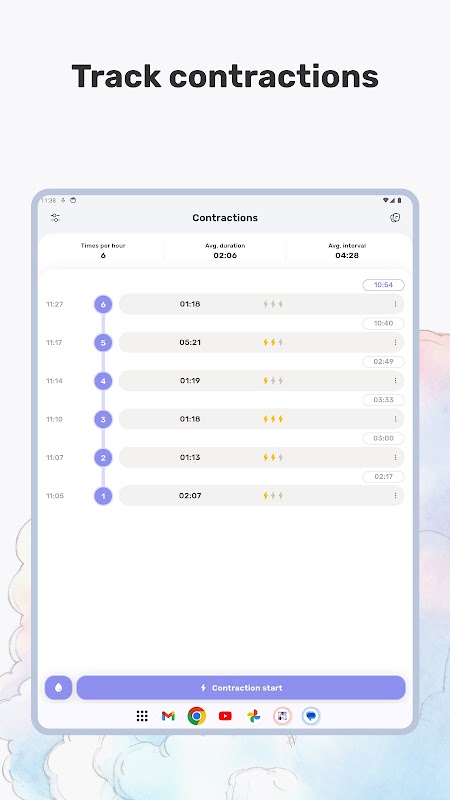 1. Sezgisel Kasılma Zamanlayıcısı: Kullanımı kolay kasılma zamanlayıcımız, kasılmalarınızın süresini ve sıklığını tek bir dokunuşla takip etmenize olanak tanır. Bir kasılma başladığında başlat'a basmanız ve bittiğinde durdurmanız yeterlidir. Uygulama, kasılmalar arasındaki süreyi otomatik olarak hesaplayarak doğum sürecinizin net bir resmini sunar.