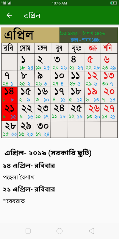 যারা খুজছেন তাদের জন্য আমাদের এই অ্যাপ। বাংলা ক্যালেন্ডার ২০১৯ নিয়ে আমাদের এই বারের আয়োজন। সরকারী ছুটিসহ ২০১৯ সালের ক্যালেন্ডার টি আপনারা পাচ্ছেন খুব