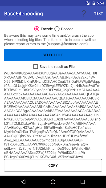 Attention: The conversion of images (especially when decoding text back to an image) can take long and/or might even crash the app. This is due to hardware limitations, as many calculations have to be done whilst converting, thus older devices are affected more.