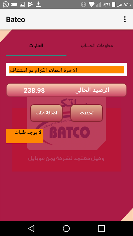 Satış noktası hizmetleri için Batco uygulaması, Yemen Mobile için internet paketlerinin toplanması ve ödenmesi