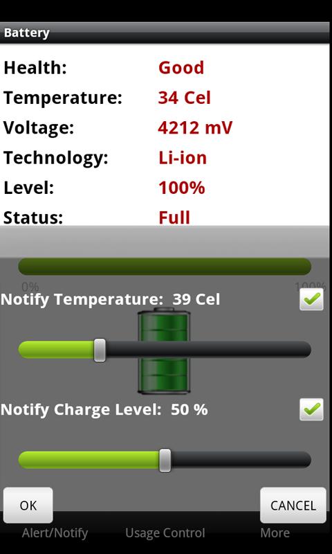 User can notify themselves when temperature is high and charge is low by setting temperature value and charging value. When this set value is reached, they will be notified in their status bar.