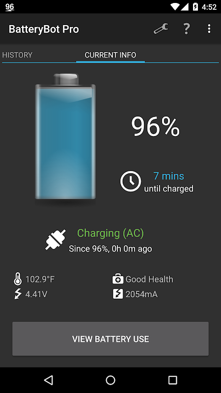 • Pil günlüğü. Pil durumu (şarj, durum, gerilim, sıcaklık) log ve CSV telefon veya ihracat üzerinde günlükleri göz atabilirsiniz.