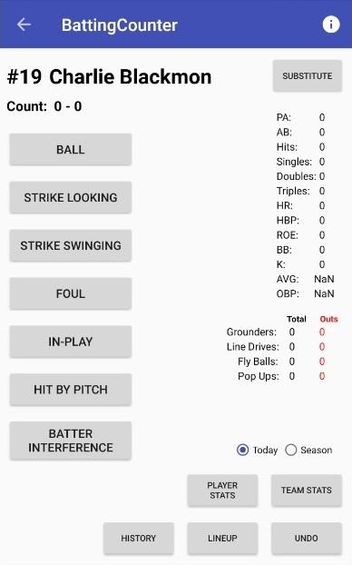 This app will track every pitch of a baseball (or softball) game from a batters perspective, and provide statistics. The intention is to track the performance of a batter over a game, or a season. 34+ different batter statistics are calculated using the tracked data.