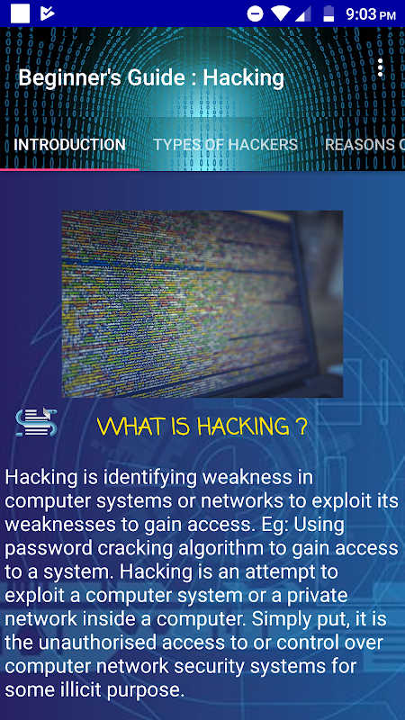 The perfect app for beginners, who are eager to learn hacking. This app introduces you to hacking, what it is and what are it types. After using this app, you will be ready for your hacking experience. This app is totally for educational purpose and does not promote any illegal work. Hope you learn something from the app.