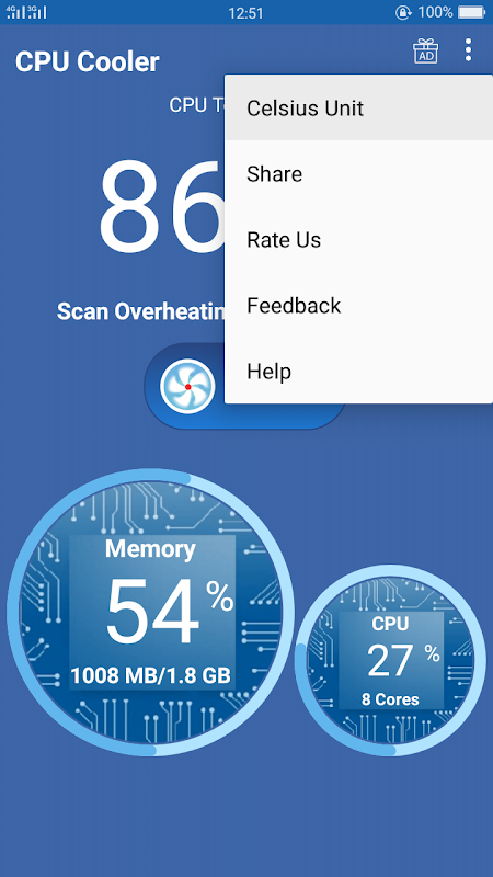 CPU soğutucusu diğer bir deyişle cool master, soğutma android telefon, soğutucu uzman ustası, telefon soğutma uygulaması, Akıllı soğutucu ana bir uygulama ve her Android cihaz için yüklemeniz gerekir. Android cihazınızı daha hızlı optimize etmek, telefonunuzu aşırı ısınmaktan korumak için CPU Soğutucu'nun keyfini çıkarın ve özellikle CPU Soğutucusu tamamen ücretsiz.