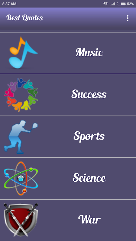 This app contains numerous quotes of various topics. Topics include Age, Anger, beauty, Business, Change, Children, Courage......etc.