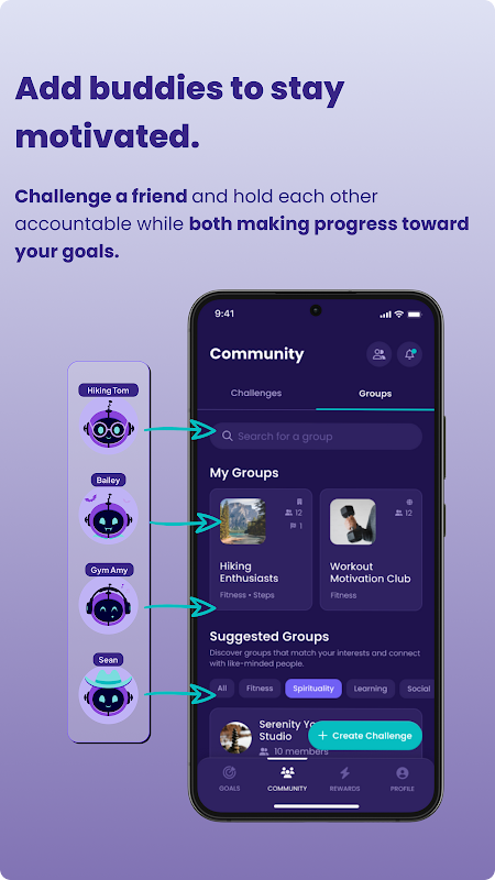 Zorluklar- Bir hesap verebilirlik ortağına sahip olmanın hedef başarı oranınızı %90'a kadar artırabileceğini biliyor muydunuz? Adımlar veya uyku gibi alanlarda bir arkadaşınıza meydan okuyun ve her ikisi de hedeflerinize ulaştığınız için ödüllendirilsin.