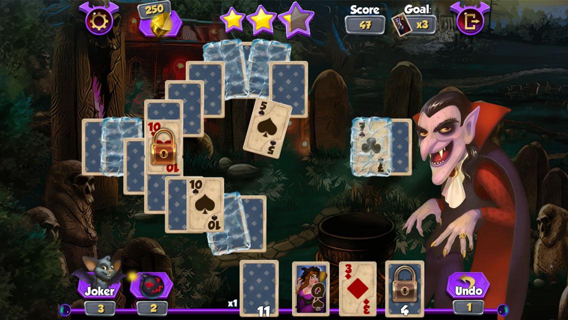 Casper, a little ghost, dreams to be alive. Solve some challenging puzzles in the mysterious world of vampires, witches and ghosts so that his dream comes true! Remove all cards by selecting open cards that are 1 higher or 1 lower than the open card. Click on the stock to get a new open card. The joker can be used for any card! The main advantages of this excellent game are: hundred levels; various bonuses, challenges and power-ups; breathtaking graphics; vivid and frightening characters and addictive gameplay!