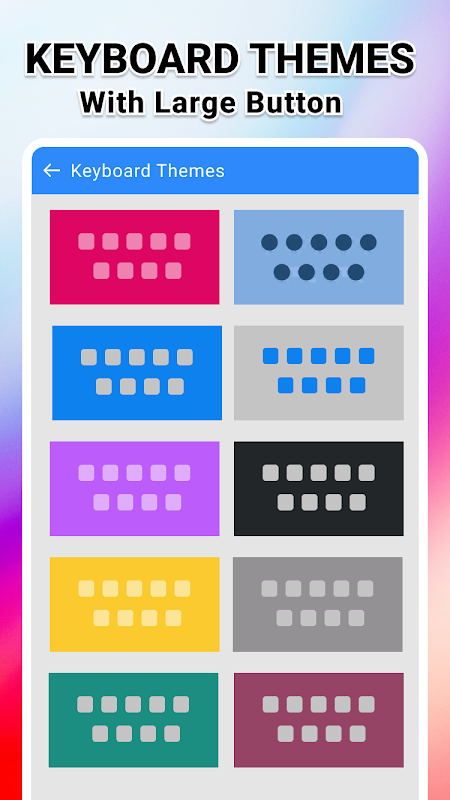 Büyük düğmeli klavye: büyük tuşlu büyük düğmeli klavye, giriş metnini hızlı yazmanıza yardımcı olur. Klavye uzantınızda küçük tuşlar varsa ve yazarken zorluk yaşıyorsanız endişelenmeyin çünkü bu android klavye büyük düğmeler google app klavyesi, metninizi kolayca yazmanız içindir. Büyük tuşlara ve sayı satırı klavyesine sahip bu büyük düğme klavyesi, büyük tuşlu alfabelerden oluşur, büyük düğme sayısal harfleri ve büyük düğme alfa sayısal düğmesi, hızlı metin yazmanıza olanak tanır. bu büyük düğme yazarak tuş takımı ile zaman. Büyük düğmeli klavye: büyük düğmeli hızlı tuş klavyesi iyi hızlı ve kolay sesle yazma için kullanıcı deneyimine sahip ve kullanıcı dostu büyük düğmeli klavye1.