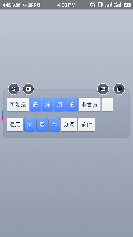 3 使用类似IPHONE悬浮按钮拖动方式触发大爆炸功能,只需要移动浮动按钮到文字并点击按钮即可,不使用锤子很容易出错的“一大块肉按压”触发方式。