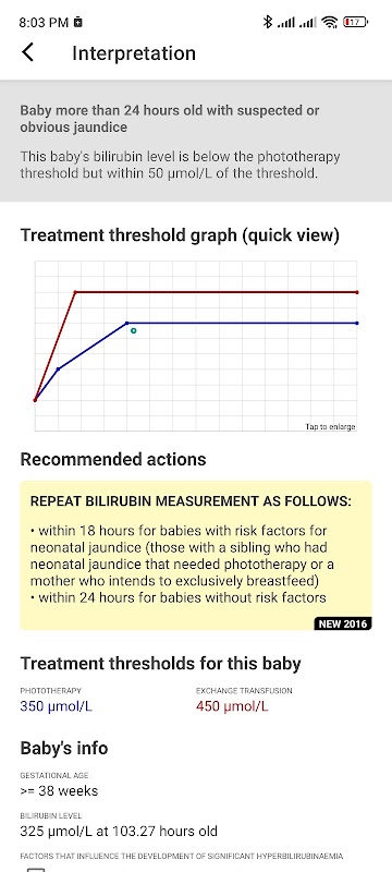 • Tedavi eşiği grafiklerini görüntüler ve bilirubin seviyesini çizer