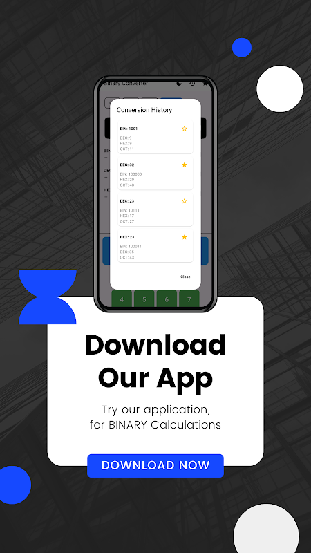 İkili Hesap Makinesi'ni bugün indirin ve ikili sayıları kullanma şeklinizde devrim yaratın. Dönüşümlerinizi basitleştirin, üretkenliğinizi artırın ve işlevselliği modern, kullanıcı dostu bir tasarımla birleştiren bir uygulamanın keyfini çıkarın!